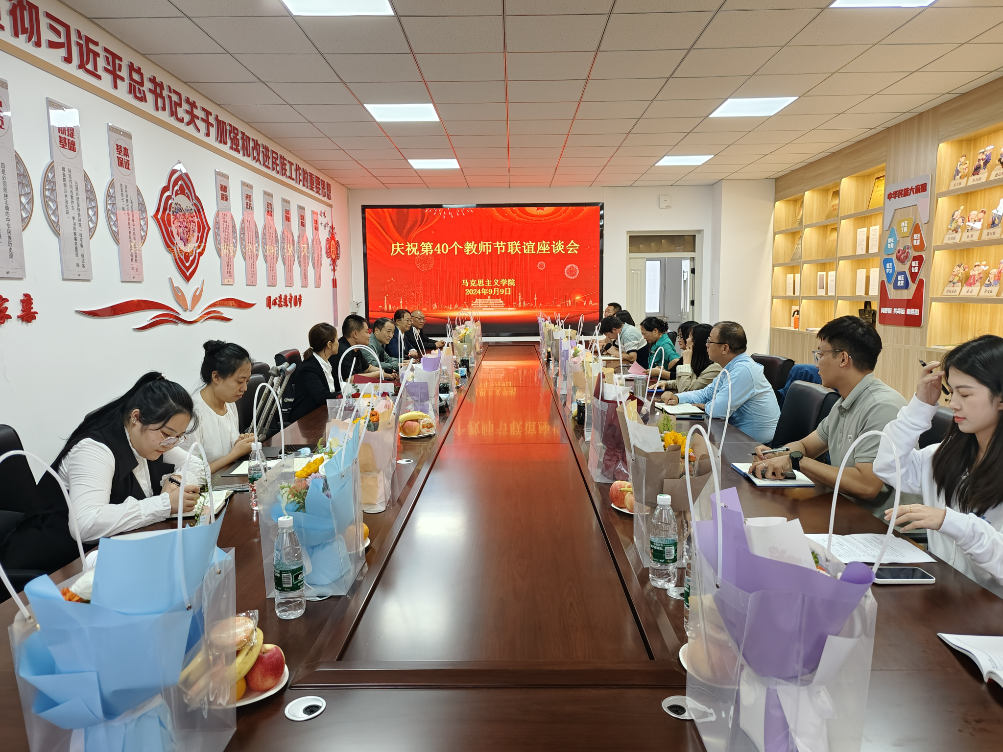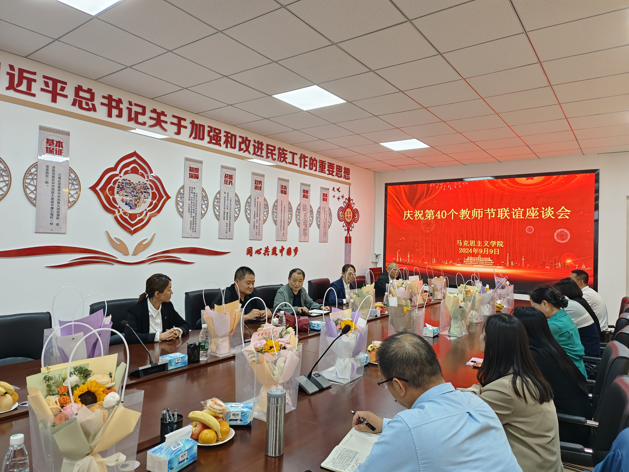 为大力弘扬教育家精神,展现新时代高校思政课教师立德树人、自信自强的精神风貌,在全国第40个教师节来临之际,9月9日下午,永利yl23411在秋实楼(扩建)502会议室召开了庆祝第40个教师节联谊座谈会。学院领导班子、学院各教研室教师代表参加了座谈会。
