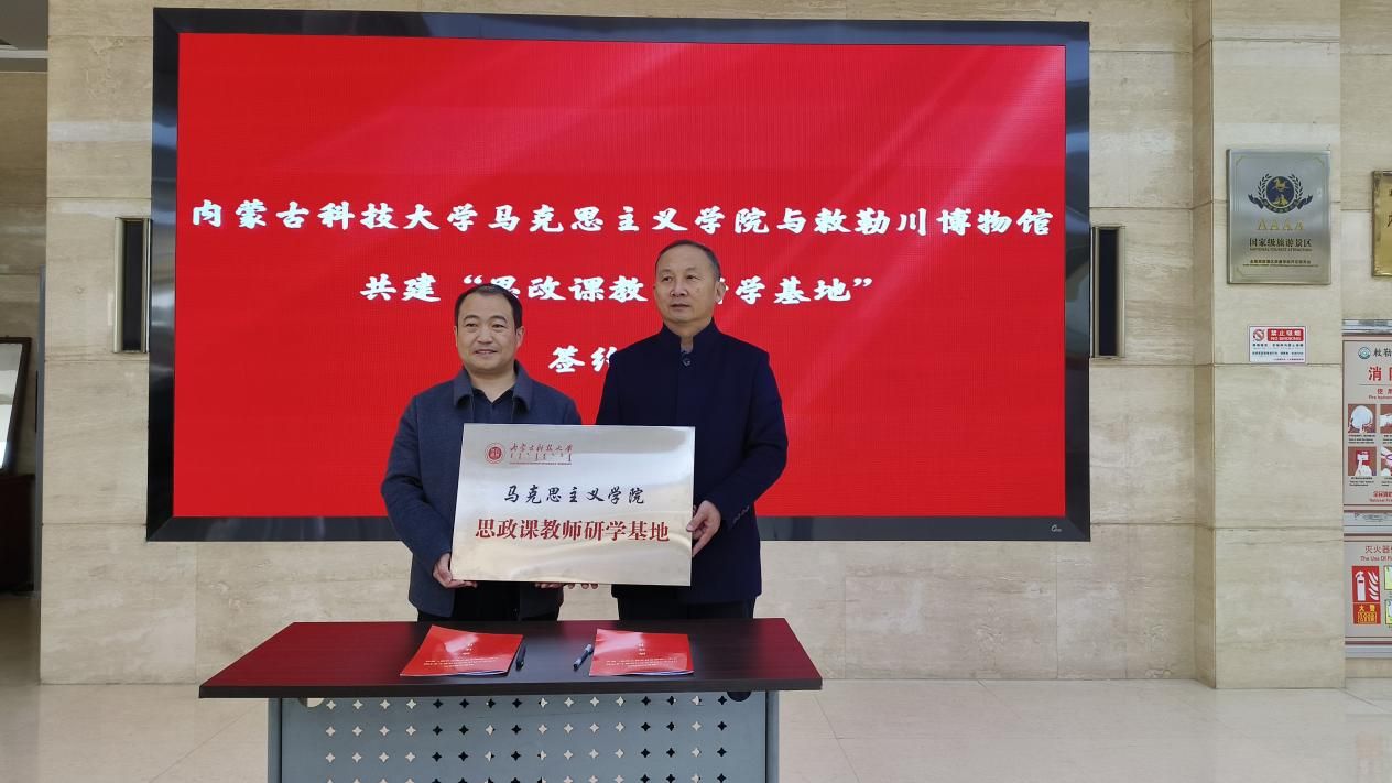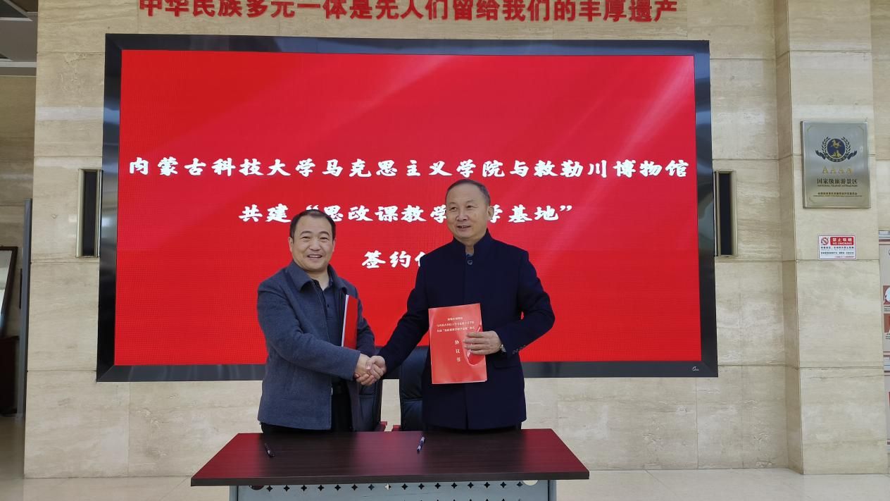 首先,永利yl23411副经理杨德桥与土右旗敕勒川博物馆馆长赵俊峰共同签署“思政课教师研学基地”共建协议,并举行授牌仪式。双方一致表示,永利yl23411在土右旗敕勒川博物馆设立“思政课教师研学基地”,通过一系列的合作共建举措,促进校地双向赋能、同频共振,力争在学习研究、实践教学、社会服务、精神传承、校馆合作等领域取得建设性的效果。