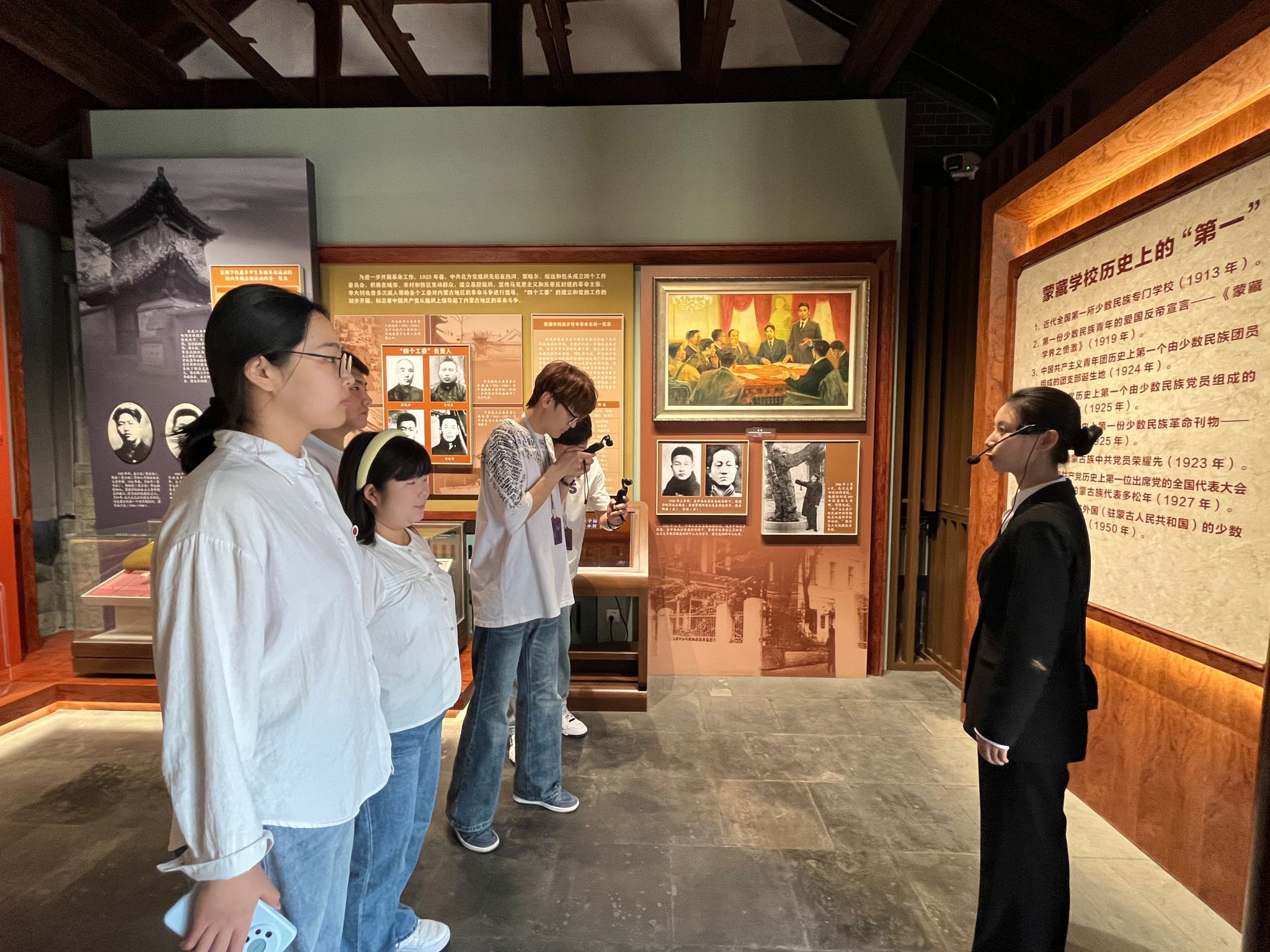 蒙藏学校是展示党的民族工作伟大成就的重要窗口、构筑中华民族共有精神家园的重要阵地、推动各民族交往交流交融的重要场所、讲好中华民族共同体故事的重要平台。李大钊、邓中夏、赵世炎等革命先驱在蒙藏学校播撒革命火种,向蒙古族青年员工传播马克思主义,培养出了内蒙古最早的一批共产党员,因此被誉为“内蒙古革命的摇篮”。师生们先后参观了“蒙藏学校旧址专题展”、“中华一脉 同心筑梦——中国共产党民族工作光辉历程和伟大成就主题展”以及中华优秀文化体验区,深入了解了马克思主义在少数民族中的传播历程、中国共产党成立百年来在民族工作方面所取得的光辉成就与伟大贡献,亲身体验中华民族优秀传统文化的魅力与底蕴。在一件件珍贵的文物、一幅幅生动的图片前,带队教师现场教学,进一步加深了员工对马克思主义在中国的传播特别是在内蒙古地区传播的认知。活动现场,员工们还与蒙藏学校工作人员展开深度互动。