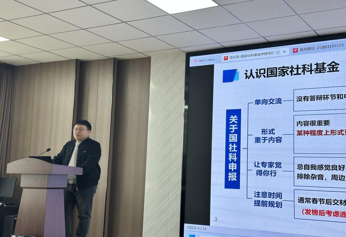 李巨星副教授基于自身主持国家社科基金项目实践经验,围绕申报书的论证逻辑、申报选题的问题意识、查找文献与撰写申请书等方面,重点剖析“问题意识”“学术热点”“地域特色”核心要素,并对申请书和活页的规范撰写和方法技巧作了翔实而生动的报告。