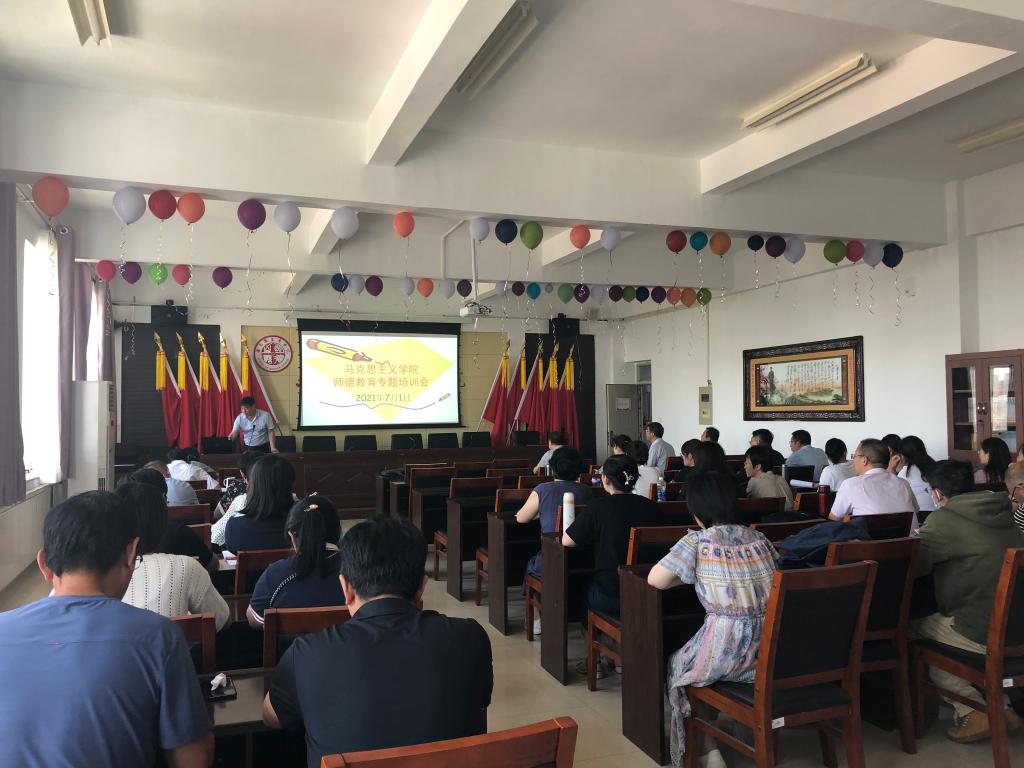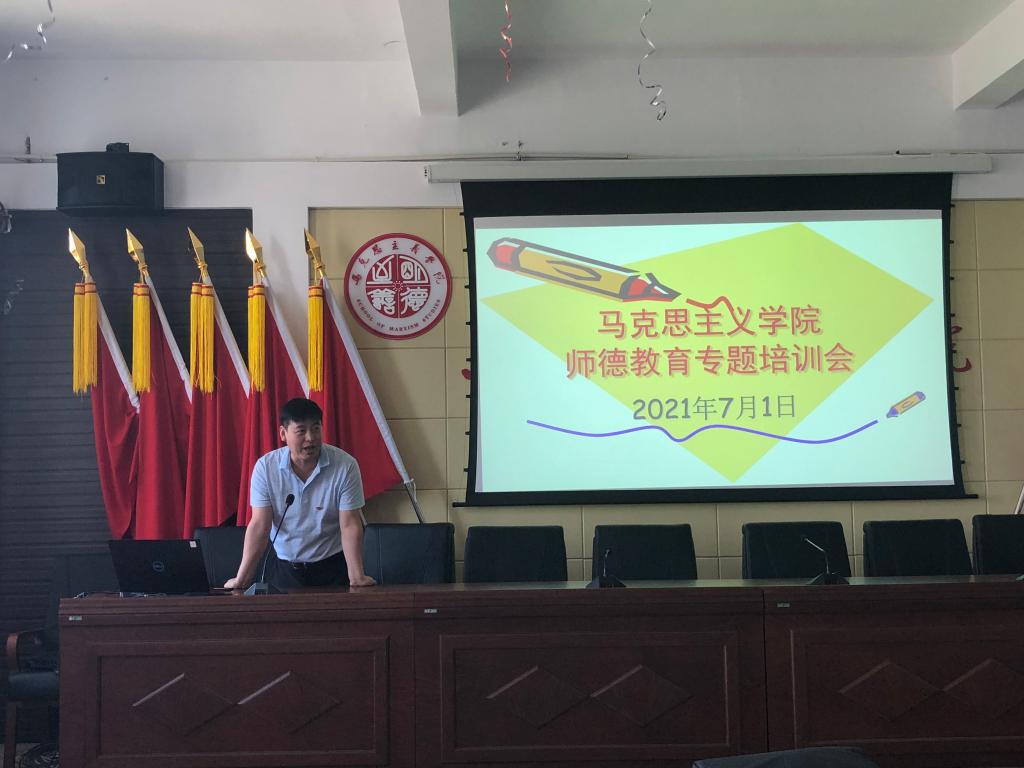 党总支书记马广辉首先领学了习近平总书记关于“三个牢固树立”“四有”好老师、“四个引路人”“四个相统一”“六要”等与师德建设相关的重要论述。然后介绍召开本次会议的背景要求,按照学校统一要求,学院成立了师德专题教育工作小组,制定了师德专题教育工作方案。会议要求全体教师按照学院制定的方案认真参加学习,以党史学习教育为主线强化教师“四史”学习教育,将“四史”学习作为全体教师思想政治教育“必修课”。