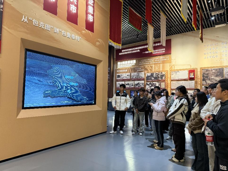 在展馆内,同学们通过详实的图文史料、珍贵的实物展品以及生动的影像资料,深入了解了包钢建设初期那段艰苦卓绝而又激情燃烧的岁月。来自全国各地的各族儿女,响应国家号召,汇聚草原钢城,风餐露宿,手拉肩扛,在戈壁荒原上建起了这座现代化钢城,创造了“齐心协力建包钢”的工业奇迹和民族团结佳话。