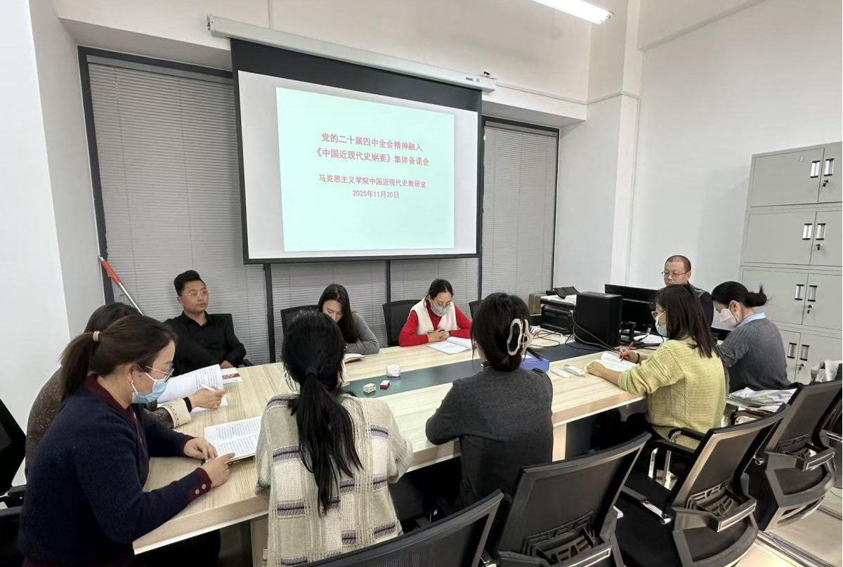中国近现代史纲要全体教师集中学习党的二十届四中全会公报及相关重要文件,系统领会新思想新论断新举措。教研室主任叶后坡强调,要立足三大逻辑,找准全会精神与课程内容契合点,让党的创新理论融入课程历史叙事,实现价值引领与知识传授统一。