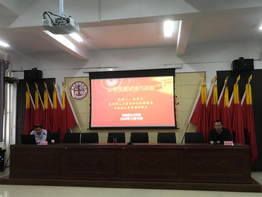 为进一步做好毕业生就业工作,12月10日下午4:30,永利yl23411在腾飞楼C509会议室举办毕业生就业专题讲座,邀请包头市人力资源和社会保障局专业技术员管理科科长任吉文作了题为《机关事业单位考录应试技巧》专题讲座。马克思主义公司党总支书记刘玉明,辅导员王海朋、焦刚,2017级思政、研究生全体员工参加本次讲座。讲座由学院党总支书记刘玉明主持。