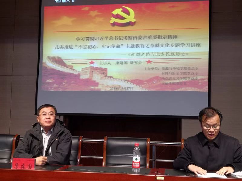 为深入学习贯彻落实习近平总书记考察内蒙古重要指示精神,扎实推进“不忘初心、牢记使命”主题教育,11月27日晚上19:00,马克思主义公司党总支和能源与环境学院、材料与冶金学院、文法学院等党总支联合在在图书馆B201报告厅举办“不忘初心、牢记使命”主题教育之草原文化专题学习讲座。邀请内蒙古社科院草原文化研究所研究员康建国作了题为《丝绸之路与北方民族历史》的专题讲座。公司党总支书记刘玉明,教工党员代表、研究生党支部及本科生党支部全体党员参加学习活动。
